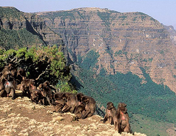 Gelada baboons, rare Ethiopian wolf, Bale Mountains.